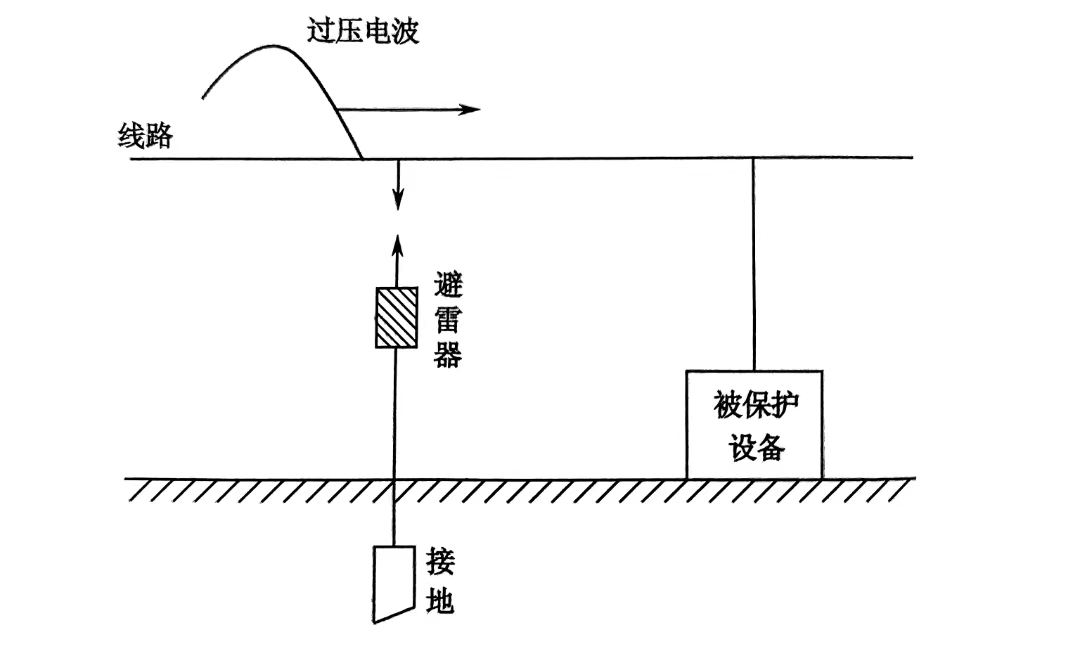 避雷器用來保護(hù)設(shè)備不受雷電波入侵的損害。其防雷原理如下:通過間隙擊穿達(dá)到對地放電的目的。避雷器必須與被保護(hù)設(shè)備并聯(lián),如下圖所示。