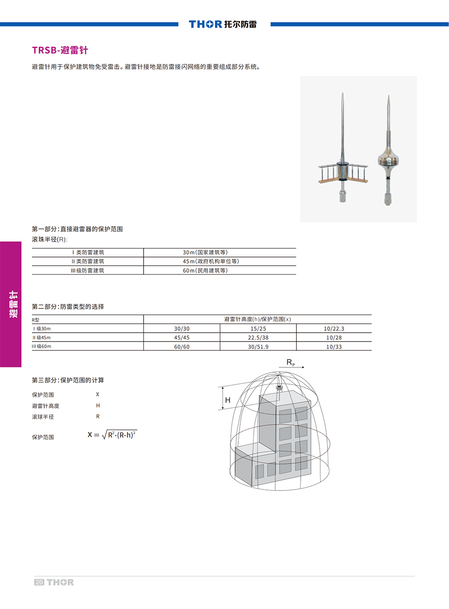 TRSB系列避雷針是用來(lái)保護(hù)建筑物、高大樹(shù)木等避免雷擊的裝置。在被保護(hù)物頂端安裝一根接閃器,用符合規(guī)格導(dǎo)線與埋在地下的泄流地網(wǎng)連接起來(lái)。避雷針規(guī)格必須符合G B標(biāo)準(zhǔn),每一個(gè)防雷類別需要的避雷針高度規(guī)格都不一樣。