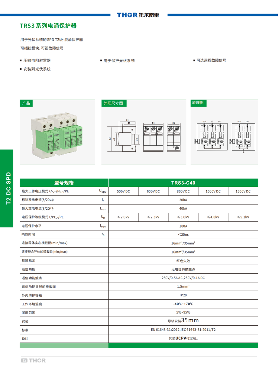 TRS3系列電涌保護器適用于新能源太陽能光伏發(fā)電系統(tǒng)或其他直流電源系統(tǒng)的防雷保護,最大持續(xù)工作電壓DC500V、800V、1000V。安裝位置在直流電路總電源系統(tǒng)中,對間接雷電流、直接雷電流或其它瞬間過電壓進行保護。