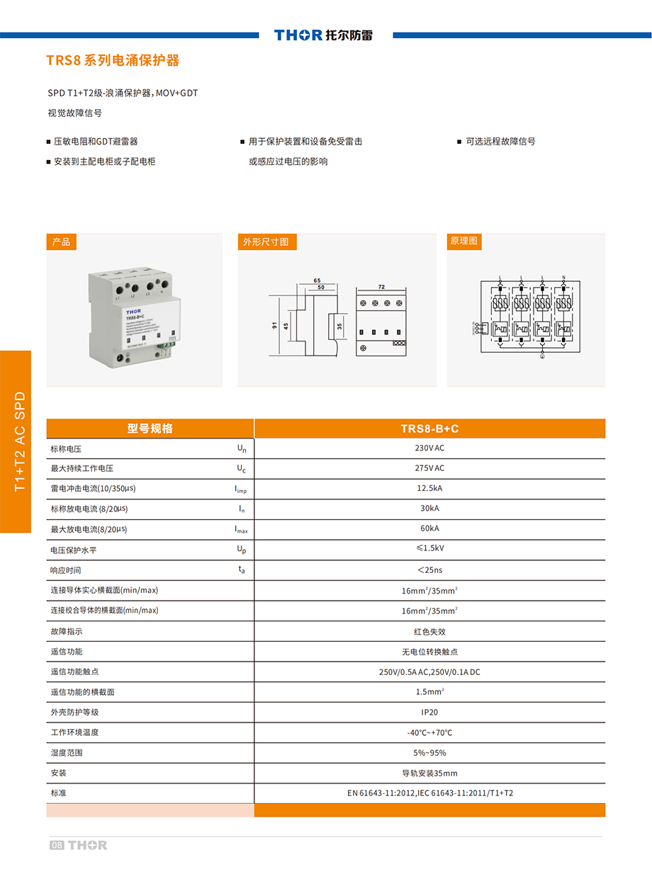 TRS8系列電涌保護(hù)器(以下簡稱SPD)適用于交流50/60Hz,額定電壓至380V的IT、TT、TN-C、 TN-S、TN-C-S,等供電系統(tǒng),對間接雷電和直接雷電影響或其他瞬時(shí)過電壓的電涌進(jìn)行保護(hù)。
